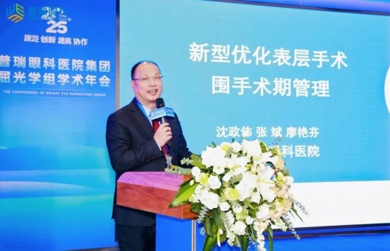 湖北普瑞眼科医院沈政伟教授的演讲课题为《新型优化表层手术围手术期管理》。沈政伟教授分享了新型优化表层手术的围术期管理经验,系统介绍了其改良的丁基橡胶酒精壶专利,重点阐述了覆盖术前至术后的全流程管理要点及配套的围术期用药方案。